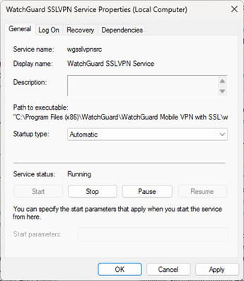 - The WatchGuard SSLVPN Service shows a status of Stopped or Disabled in the Windows Services list.