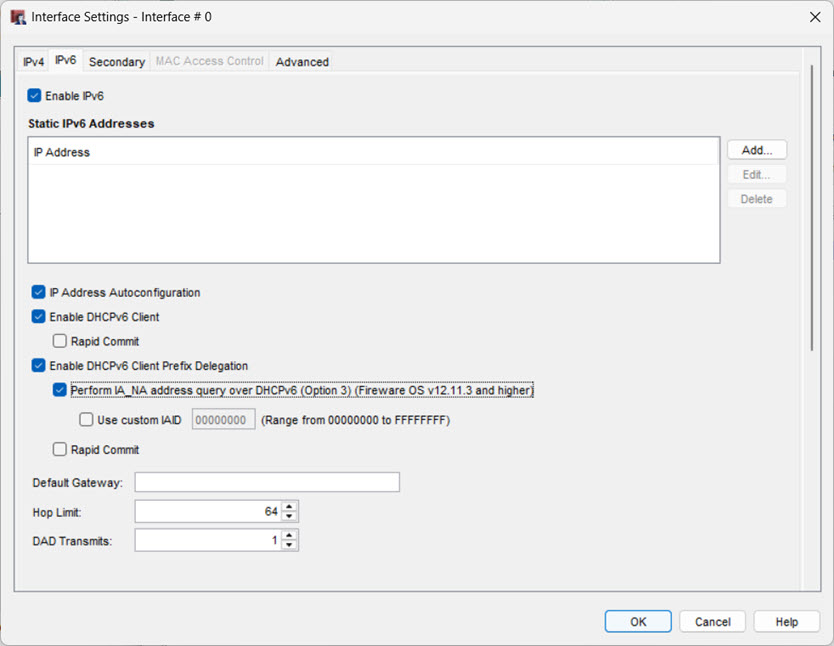 In Fireware v12.11.3 and higher, when you enable DHCPv6 Client Prefix Delegation, this enables DHCPv6 Client Option 25 (Identity Association for Prefix Delegation) by default and also provides the option to enable DHCPv6 Client Option 3 (Identity Association for Non-Temporary Address) and set a custom IAID (Identity Association Identifier).