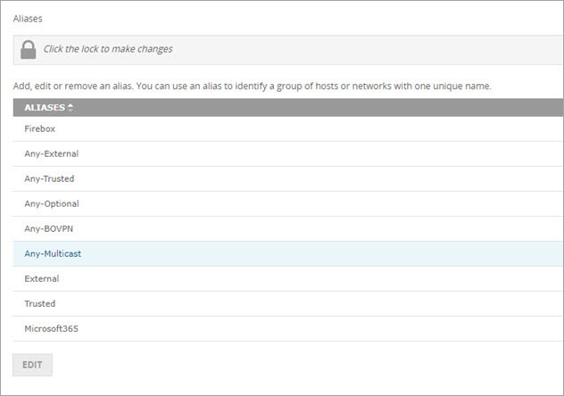 You can also create aliases when you use Centralized Management for your Firebox and apply a Device Configuration Template to a Firebox. For more information about how to use aliases in templates, go to Create Device Configuration Templates.