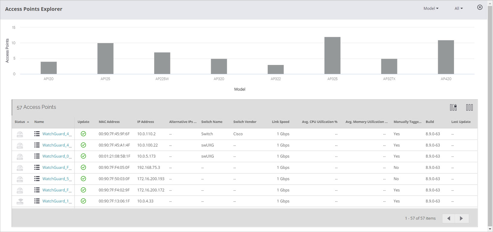 Access Points Explorer provides an overview of all APs at a location and enables you to view a graphical AP distribution based on selected AP properties.