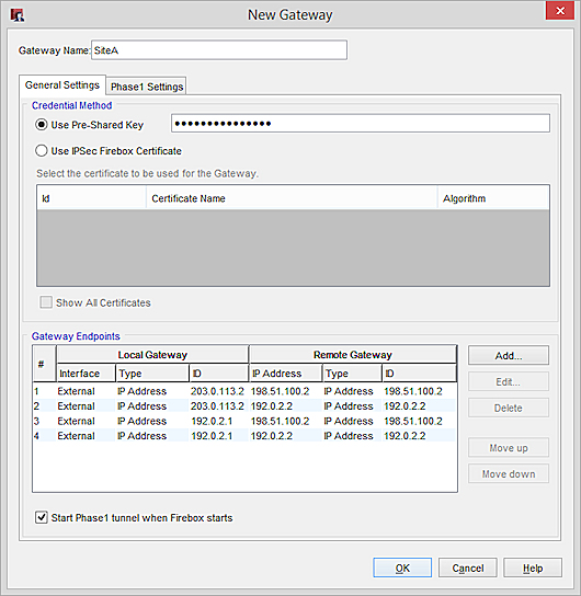 Complete los mismos pasos en el Firebox remoto para agregar cuatro pares de puerta de enlace con las direcciones IP locales y remotas.
