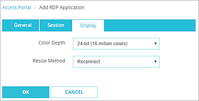 - Para cambiar el Método de Cambio de Tamaño, en la lista desplegable seleccione Reconectar o Deshabilitado. Si mantiene la configuración predeterminada de Reconectar, la sesión se desconecta automáticamente si el tamaño de la pantalla del cliente cambia, y se reconecta con el nuevo tamaño de la pantalla.
