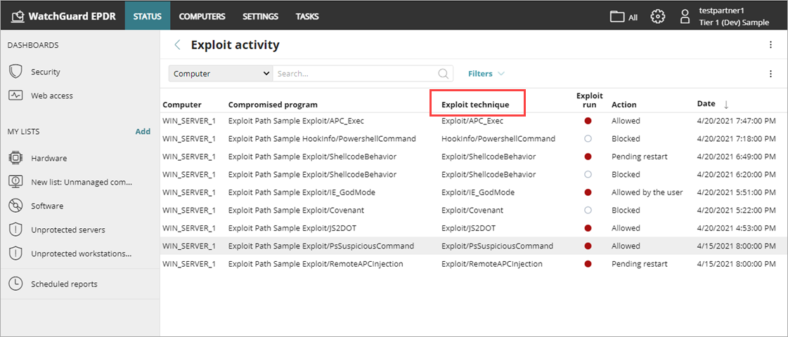 La tabla Actividad de Exploit muestra la técnica de exploit detectada, así como el nombre del programa en riesgo.