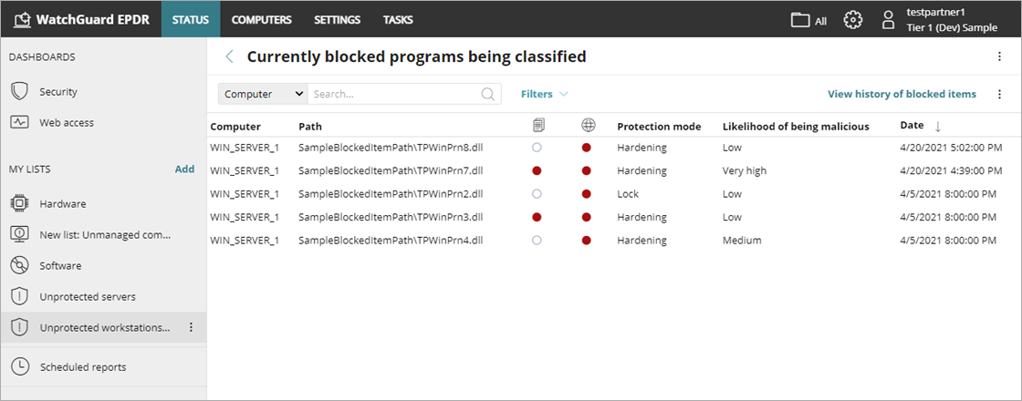 Si los elementos están bloqueados y clasificados como malware, puedes ver los mosaicos Programas maliciosos o Programas Potencialmente Indeseados en el dashboard para consultar los detalles.