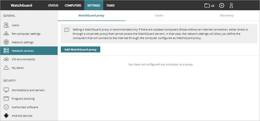 Se abre la pestaña Proxy de WatchGuard con una lista de todos los equipos que se han designado como proxy de WatchGuard.