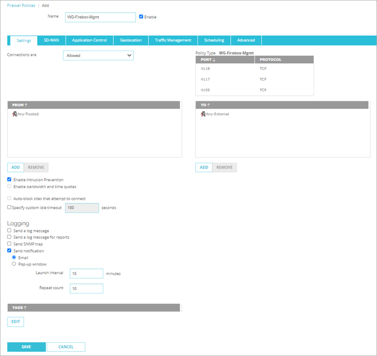 - En la lista desplegable Filtrado de Paquetes, selecciona WG-Firebox-Mgmt. Haz clic en Añadir Política.