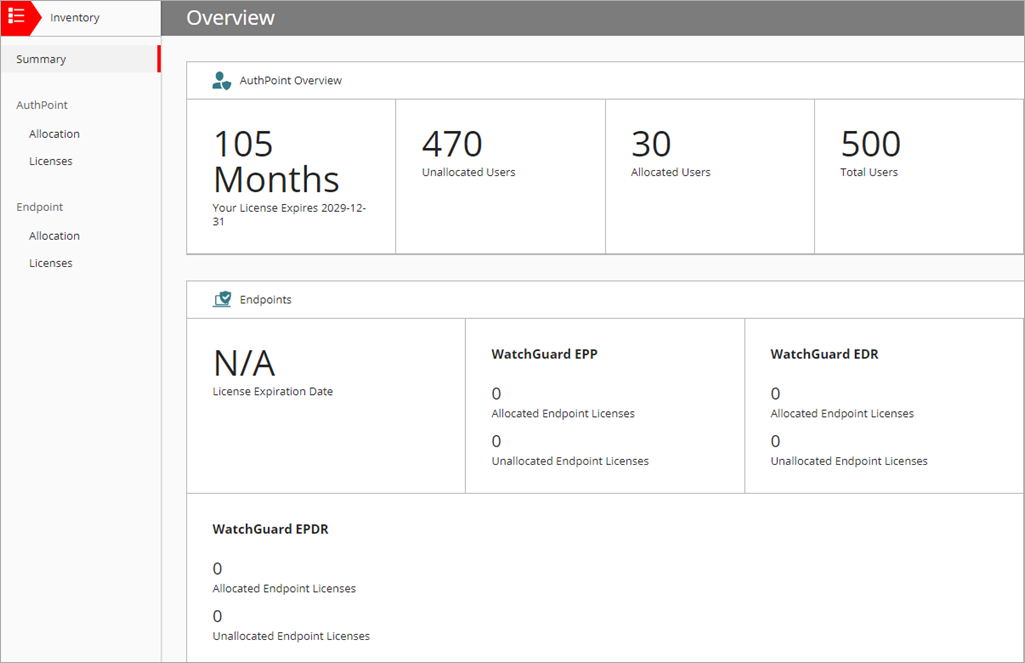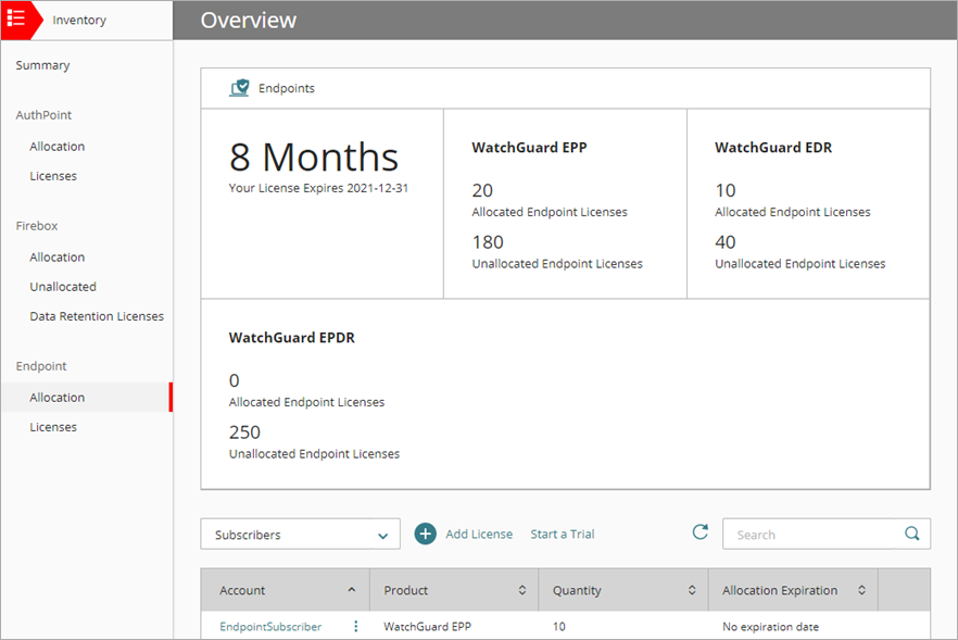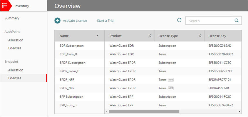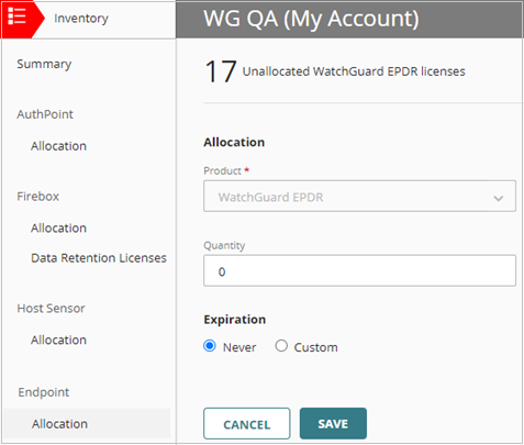 Las licencias de seguridad de endpoint activadas por un Service Provider aparecen en la página Inventario de WatchGuard Cloud. Como Service Provider, puedes asignar licencias de seguridad de endpoint a tu propia cuenta o cualquier cuenta que gestiones en la página Inventario.