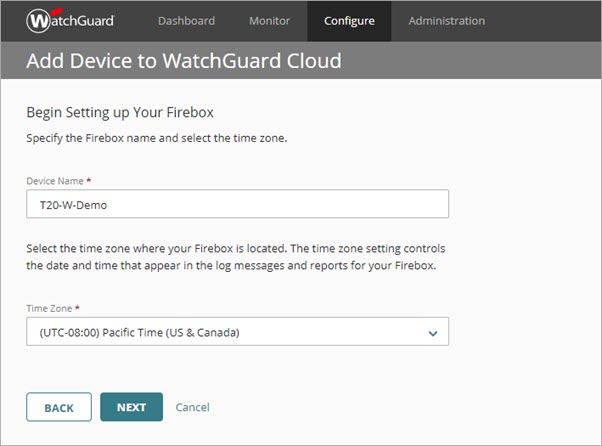 - Nombre — El nombre para identificar el Firebox en WatchGuard Cloud