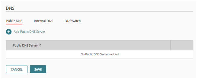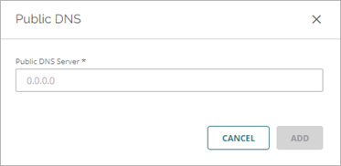 Los servidores DNS Públicos son los servidores DNS predeterminados para todas las redes y procesos locales en el Firebox. Para un Firebox gestionado en la nube que no usa DHCP en la red externa, la configuración del Firebox debe incluir al menos un servidor DNS público. Puedes añadir un máximo de tres servidores DNS públicos.