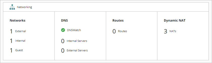 Los ajustes de conexión de red definen cómo el Firebox se conecta al tráfico entre las redes y lo enruta. Cada red está asociada a una o más interfaces del Firebox. En la página Configuración del Dispositivo para un Firebox gestionado en la nube, la sección Conexión de Red muestra un resumen de los ajustes configurados. Para ver y configurar estos ajustes, haz clic en un mosaico.