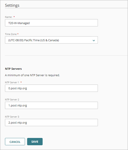 Cuando añades un Firebox a WatchGuard Cloud como un dispositivo gestionado en la nube, configuras el nombre y la zona horaria del Firebox. Se añaden automáticamente tres servidores NTP.