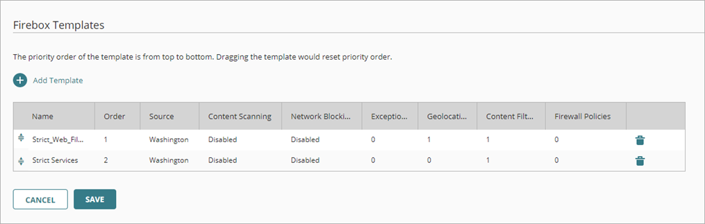 El orden de las plantillas es importante solo si el Firebox se suscribe a más de una plantilla con el Análisis de Contenido o el Bloqueo de Red habilitados. Para estos servicios, el Firebox usa los ajustes de la primera plantilla en la lista que tiene cada servicio configurado. Para obtener más información, consulta Acerca de las Plantillas del Firebox.