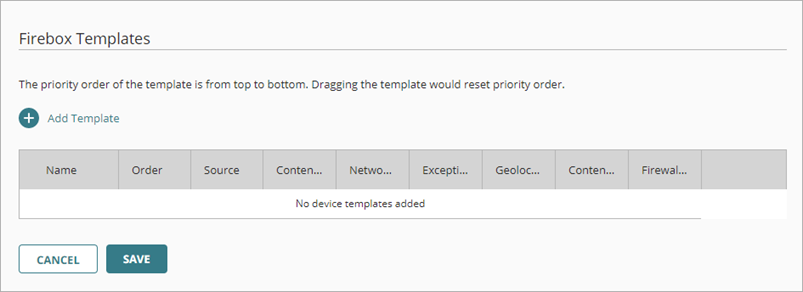 Para configurar varios Fireboxes gestionados en la nube con un conjunto estándar de políticas y servicios, puedes crear una plantilla. Después de crear la plantilla, puedes suscribir los Fireboxes a ella. Para obtener más información sobre cómo crear plantillas, consulta Gestionar Plantillas del Firebox.