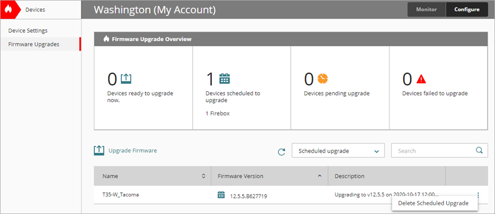 You can upgrade firmware for a device from WatchGuard Cloud. You can upgrade the firmware immediately or schedule the upgrade for a future time.