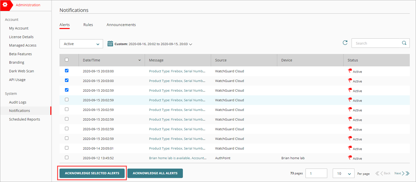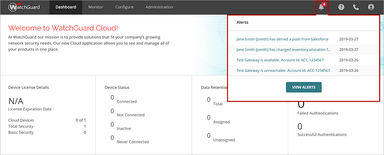 Las alertas son notificaciones sobre tu cuenta o eventos específicos que ocurren en WatchGuard Cloud, AuthPoint o un Firebox. Por ejemplo, puedes recibir una alerta de eventos cuando delegas correctamente tu cuenta o caduca una feature key del Firebox. El propósito de las alertas es avisarte de cualquier cambio significativo que afecte a tu cuenta o tus dispositivos.