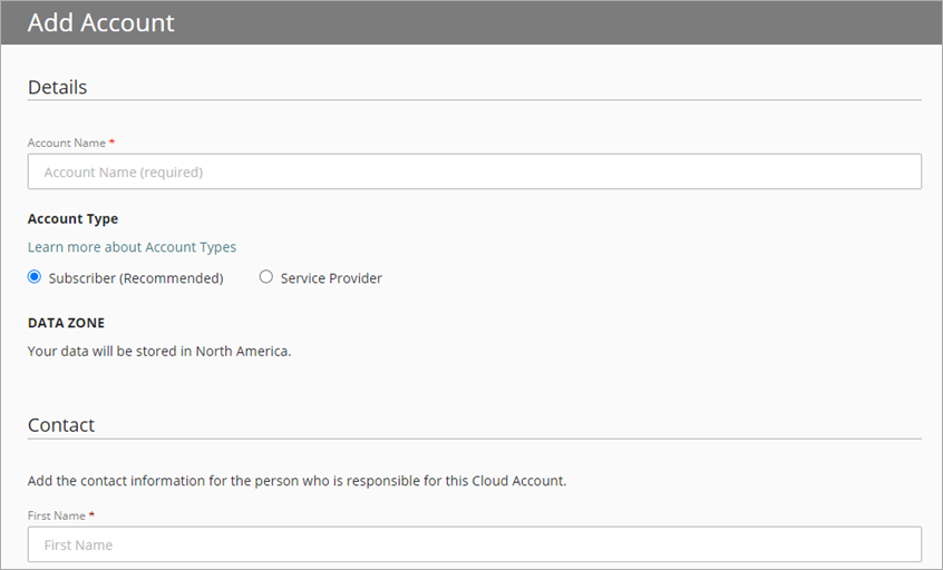 Puedes añadir cuentas gestionadas desde el Gestor de Cuenta. Puedes crear cuentas hasta en tres niveles (por ejemplo, Service Provider de Nivel 1 > Service Provider de Nivel 2 > Subscriber) y asignarlas a grupos de cuentas. Para obtener más información sobre los grupos de cuentas, consulta Gestionar Grupos de Cuentas.