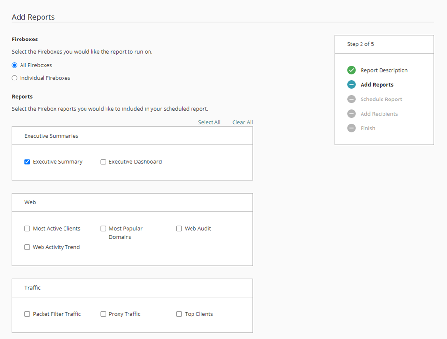 - En la sección Fireboxes, selecciona los Fireboxes que deseas incluir en los informes.