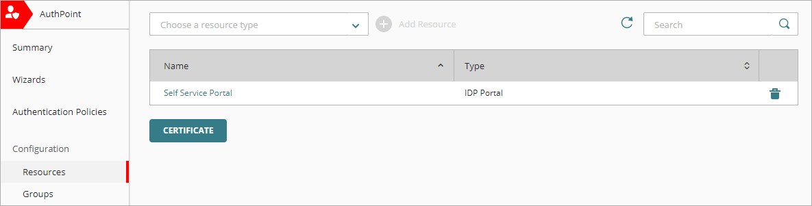 En nuestro ejemplo, añadimos un recurso del portal Identity Provider (IdP). El portal IdP es una página de portal que muestra a los usuarios una lista de los Recursos SAML disponibles para su grupo de AuthPoint. Dado que el portal IdP es un recurso de AuthPoint, puedes usarlo para probar MFA sin necesidad de configuración de terceros.