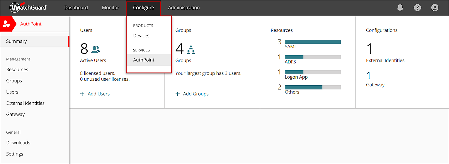 - AuthPoint Management UI — La AuthPoint management UI de WatchGuard Cloud es donde estableces y gestionas tus usuarios, tus grupos, tus recursos, tus políticas de autenticación, tus identidades externas y la AuthPoint Gateway.