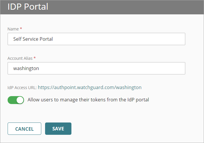 - En el cuadro de texto Alias de la Cuenta, escribe un valor único para añadirlo a la URL de tu portal IdP. En nuestro ejemplo, usamos Washington. Esto significa que la URL de nuestro portal IdP es https://authpoint.watchguard.com/washington.