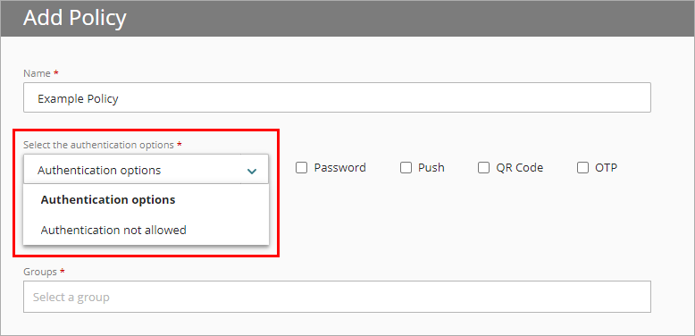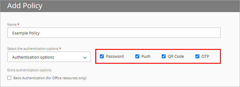 - Junto a la lista desplegable de opciones de autenticación, marca las casillas de selección Contraseña, Push, Código QR y Contraseña de Un Solo Uso. Estos son los métodos de autenticación que los usuarios pueden elegir cuando inician sesión en este recurso. La casilla de selección Contraseña requiere que los usuarios escriban su contraseña antes de autenticarse para este recurso. Para obtener más información sobre los métodos de autenticación, consulta Acerca de la Autenticación.