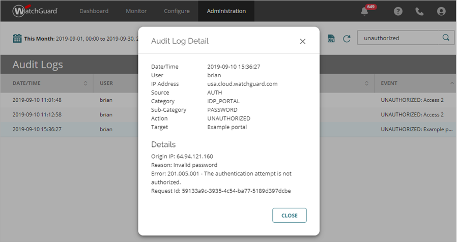 Une el código de error del log de auditoría en WatchGuard Cloud con el código de error que ves en los mensajes de log para eventos en la Gateway o en los mensajes de error de autenticación en el Portal IdP o en la Logon app para Windows o Mac. Para obtener más información, consulta Logs de Auditoría.
