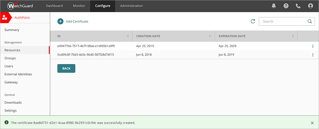 - En la página Gestión de Certificados, haz clic en Atrás para volver a la página Recursos.