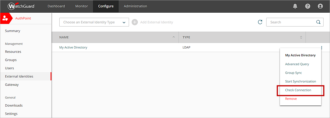 Puedes usar la opción Comprobar Conexión para probar la conexión con cualquiera de tus identidades externas de LDAP o Azure AD. Esta es una forma rápida y fácil de verificar que AuthPoint puede llegar a tu base de datos de LDAP, Azure Active Directory o Active Directory y que tu identidad externa está conectada a tu Gateway.