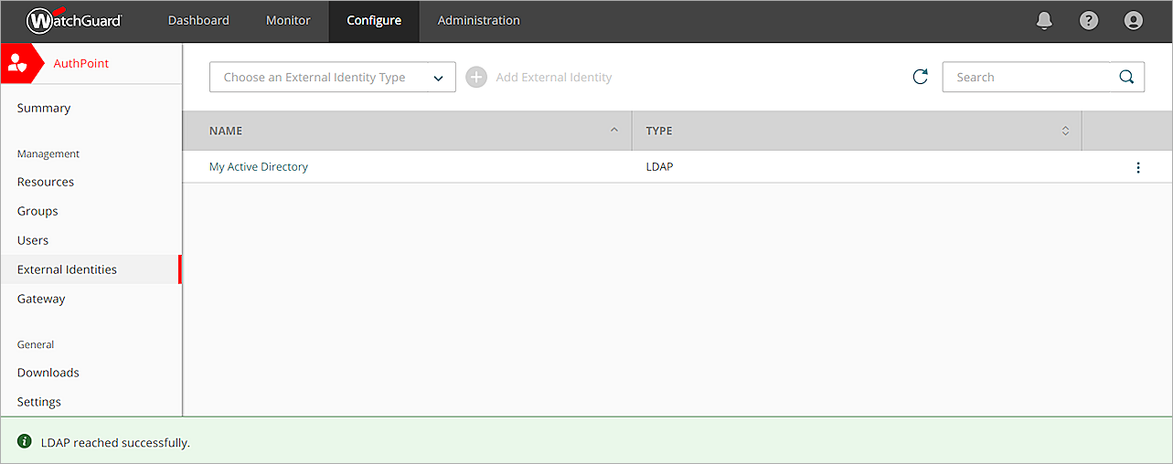 - AuthPoint intenta comunicarse con tu identidad externa. Si AuthPoint puede llegar a tu base de datos de LDAP, Azure Active Directory o Active Directory, verás un mensaje de que la operación se ha realizado correctamente después de comprobar la conexión.