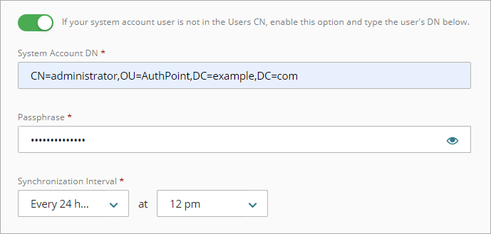 - En los cuadros de texto Cuenta del Sistema y Passphrase, escribe las credenciales de un usuario que tenga permisos para realizar búsquedas y vinculaciones de LDAP. Si este usuario no está en la carpeta Usuarios predeterminada, selecciona el botón de alternancia y escribe el nombre distintivo completo del usuario. ¡Consejo!