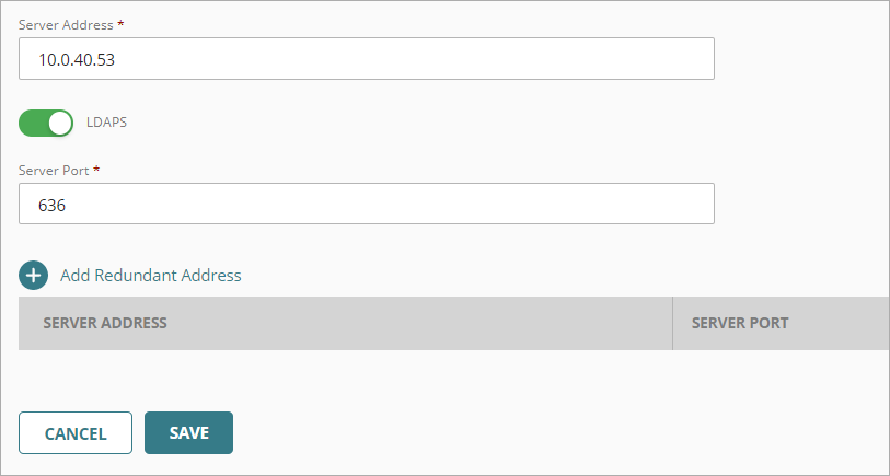 - (Opcional) Para añadir una dirección redundante para tu identidad externa, haz clic en Añadir Dirección Redundante y escribe una dirección y un puerto diferentes para la misma base de datos de LDAP.