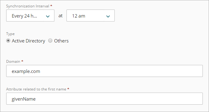 - En la lista desplegable Intervalo de Sincronización, especifica la frecuencia con la que deseas sincronizar la base de datos de LDAP. Si seleccionas Cada 24 horas, también debes especificar a qué hora se inicia la sincronización cada día.
