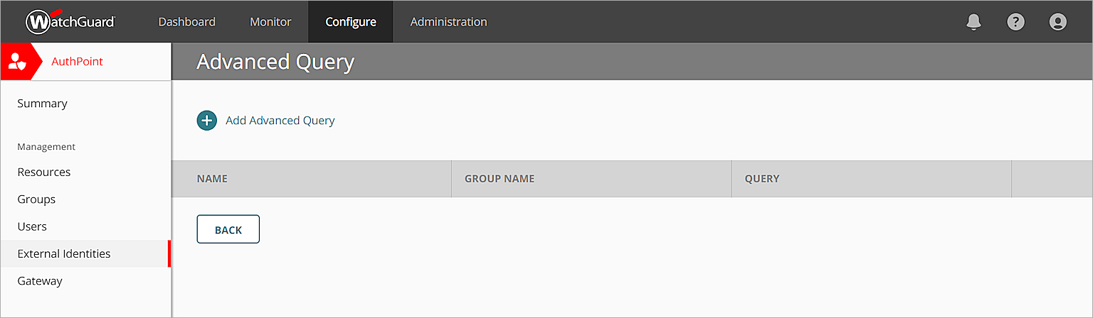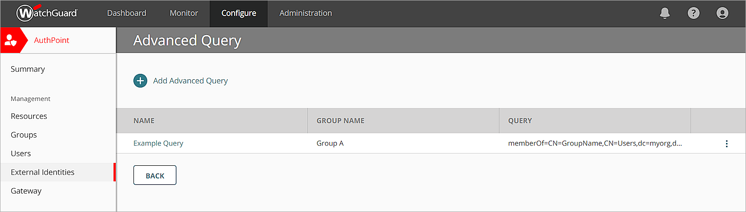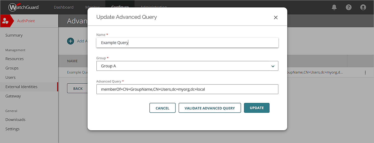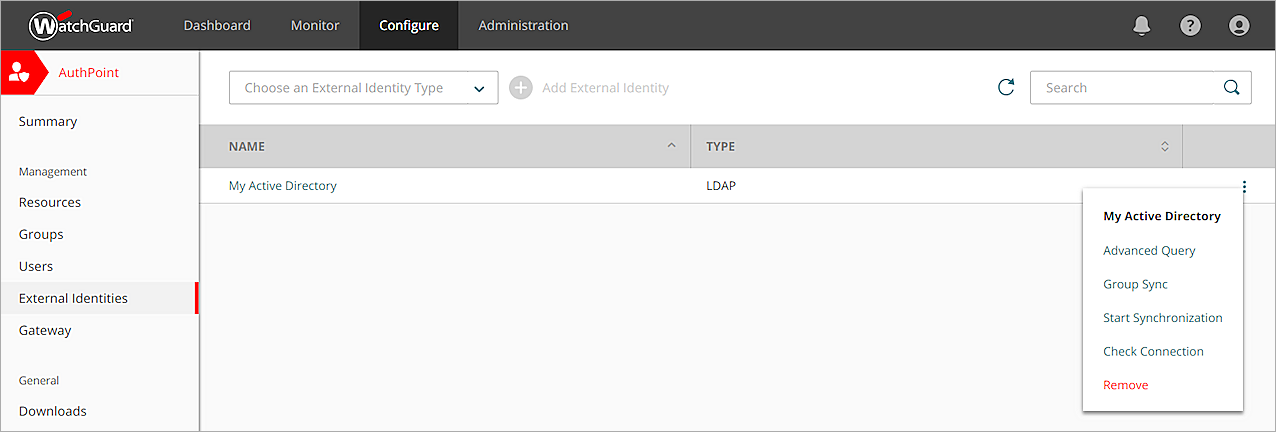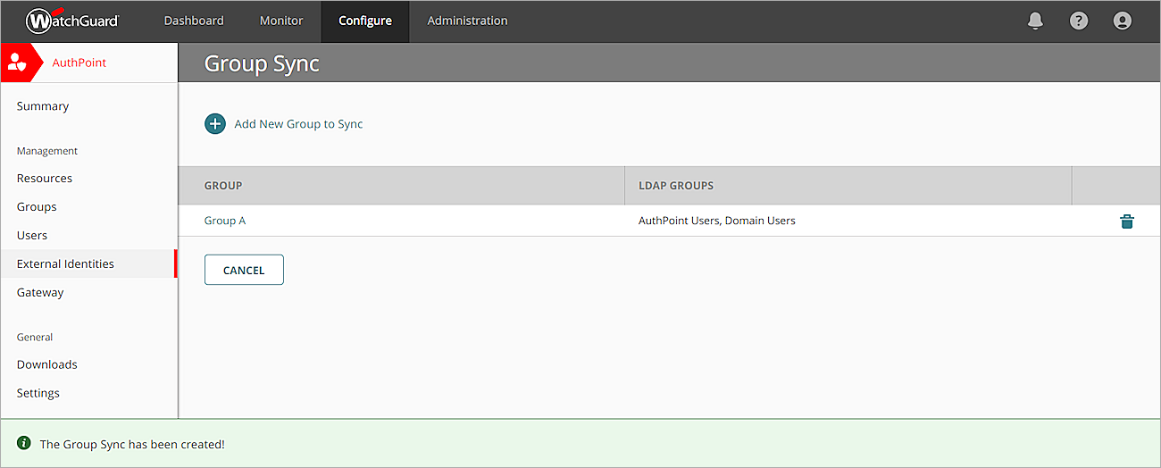 Tu identidad externa ahora está conectada a tu Gateway. Esto permite la comunicación entre WatchGuard Cloud y tu base de datos de LDAP o Active Directory.