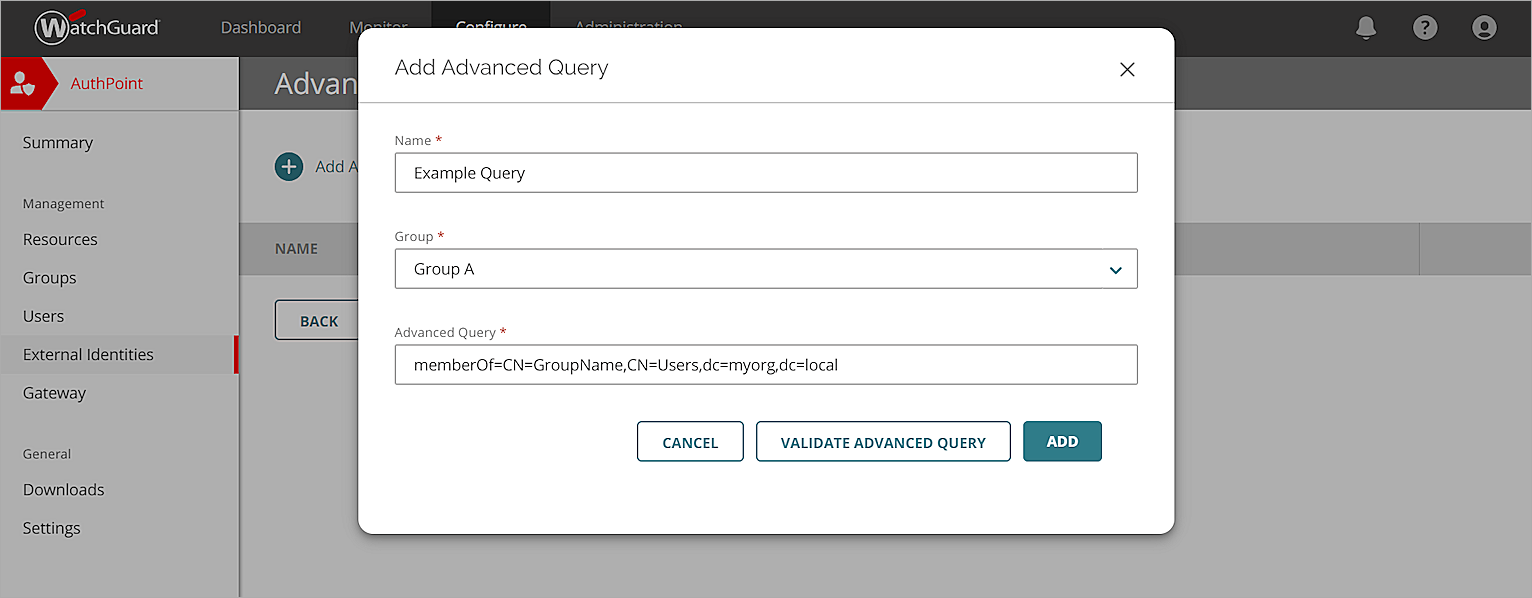 Con las consultas avanzadas, puedes crear tu propia consulta LDAP para especificar qué grupos o usuarios se deben sincronizar. Cuando añades y valida una consulta avanzada, se crean cuentas de usuarios de AuthPoint para cada usuario identificado por la consulta.