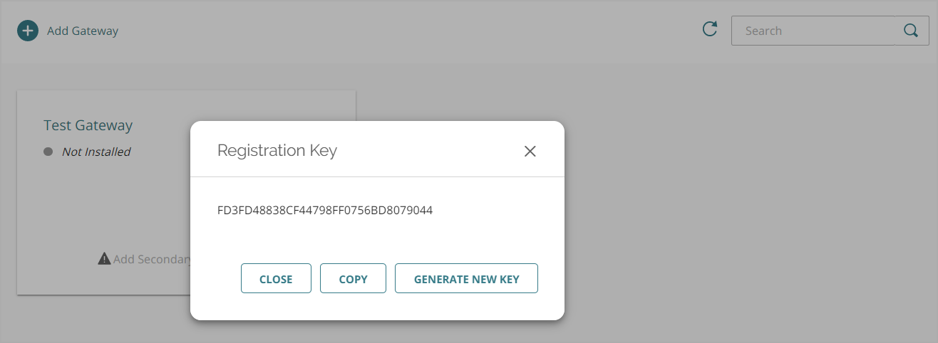 Se abre la ventana Clave de Registro. - Copia la clave de registro para la Gateway secundaria. Necesitas este valor para instalar la Gateway.