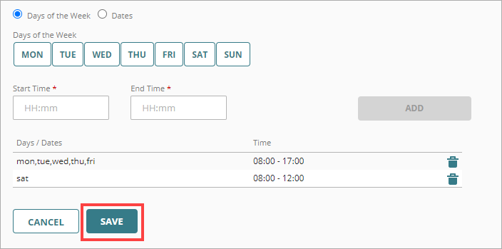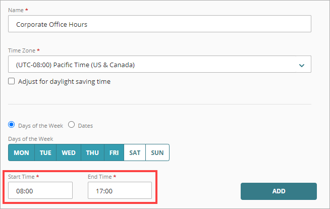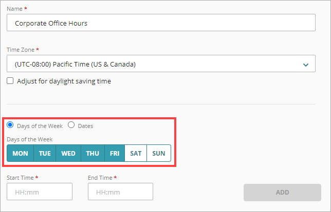 - Para añadir los días y las horas a tu horario programado, haz clic en Añadir. Para añadir días o fechas adicionales, o para especificar períodos adicionales para los mismos días o fechas, repite los Pasos 5-7.