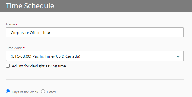 - Si deseas ajustar la zona horaria seleccionada al horario de verano, marca la casilla de selección Ajustar al horario de verano. Cuando seleccionas esta opción, la política de tiempo añade una hora inmediatamente a la zona horaria seleccionada. Por ejemplo, un horario programado con la zona horaria establecida en el Tiempo del Pacífico, que es UTC − 8 horas, se ajusta inmediatamente a UTC − 7 horas (− 8 horas + 1 hora).