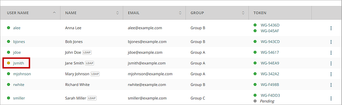 En la lista de usuarios, las cuentas de usuarios en cuarentena muestran un icono amarillo junto al nombre de usuario.