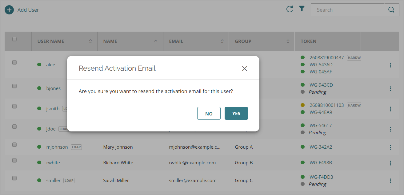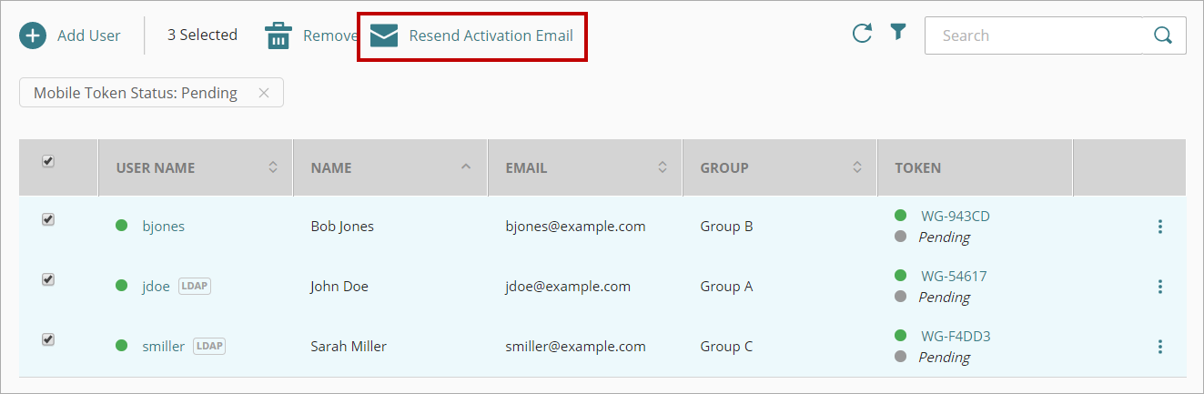 Si un usuario no activa su token en un plazo de siete días, puedes enviar al usuario un nuevo correo electrónico de activación para que pueda activar su token. Solo puedes reenviar el correo electrónico de activación a usuarios que tengan un token pendiente.