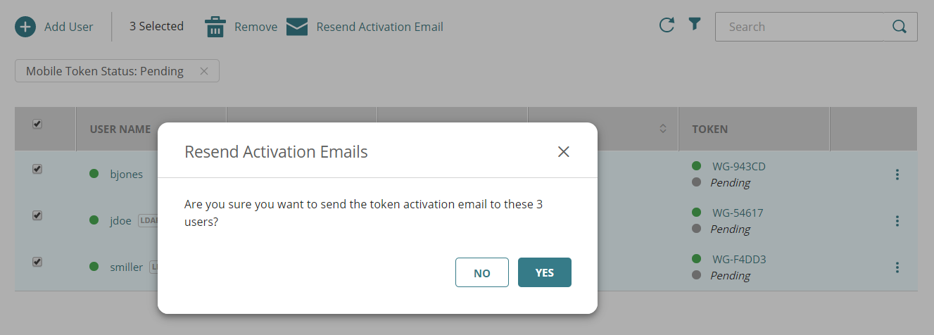 Se envía un nuevo correo electrónico de activación a cada usuario con instrucciones para activar el token.Solo puedes reenviar el correo electrónico de activación a usuarios que tengan un token con un estado de Pendiente. Si seleccionas usuarios que no tengan un token pendiente, esos usuarios no recibirán el correo electrónico de activación.