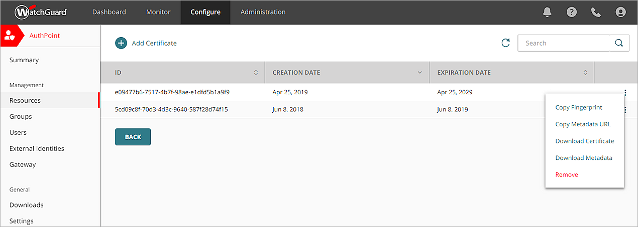 - En la página Gestión de Certificados, junto al certificado de AuthPoint que asociarás a tu recurso, haz clic en