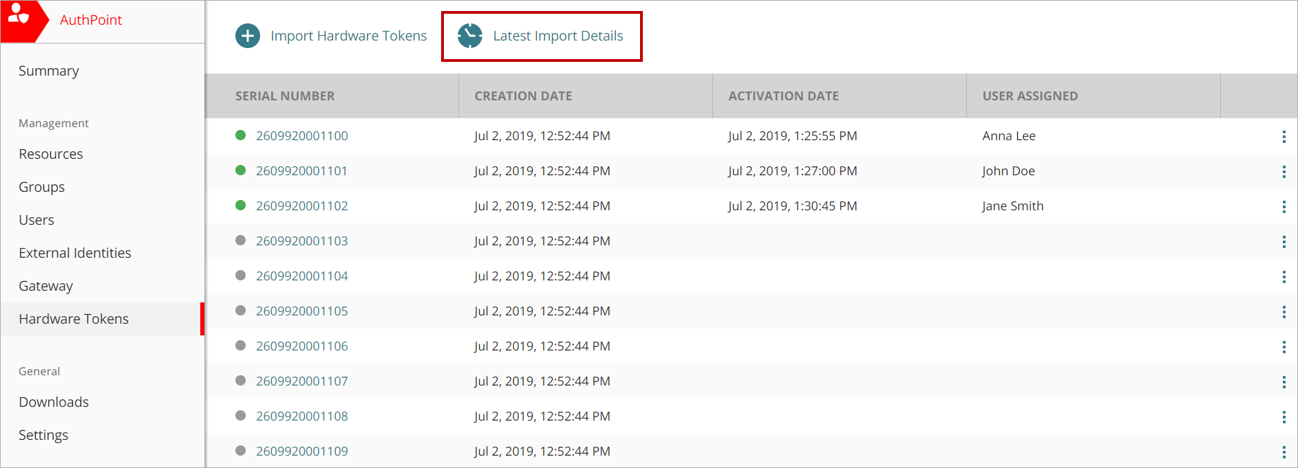 En la página Tokens de Hardware, puedes ver los detalles de la importación más reciente de los últimos siete días.