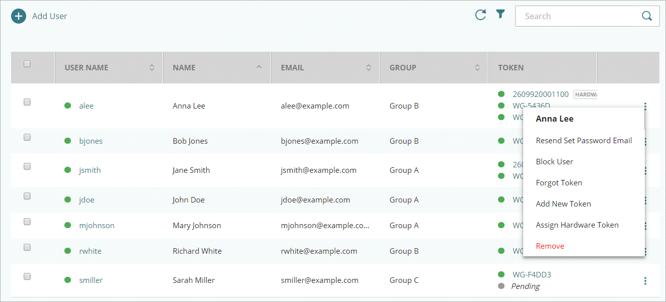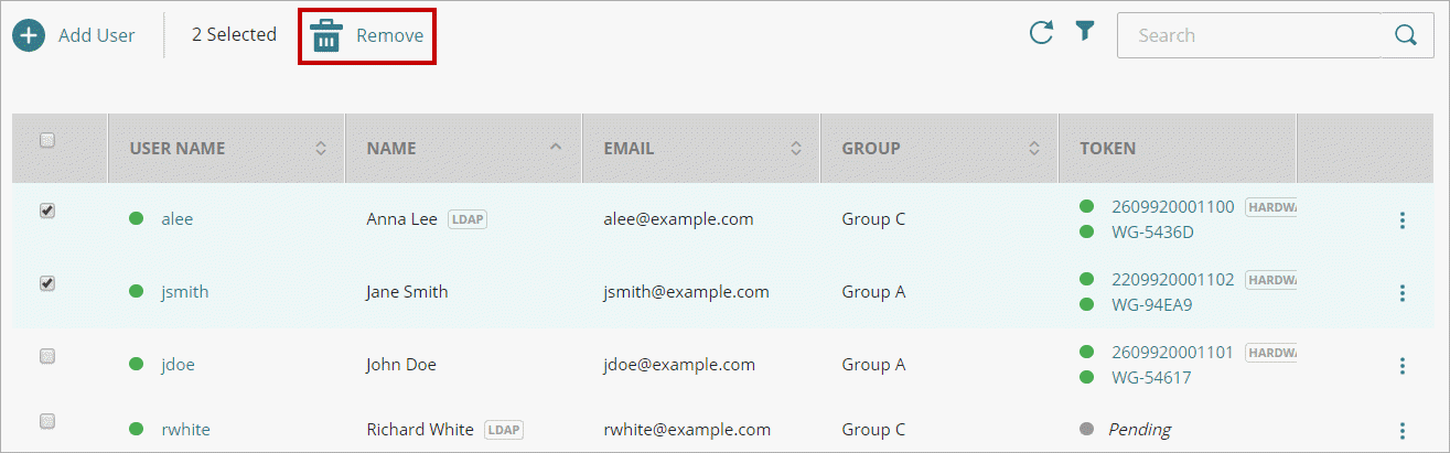 Elimina usuarios de AuthPoint de la página Usuarios en la AuthPoint management UI. Puedes eliminar usuarios individuales o puedes eliminar varios usuarios al mismo tiempo.