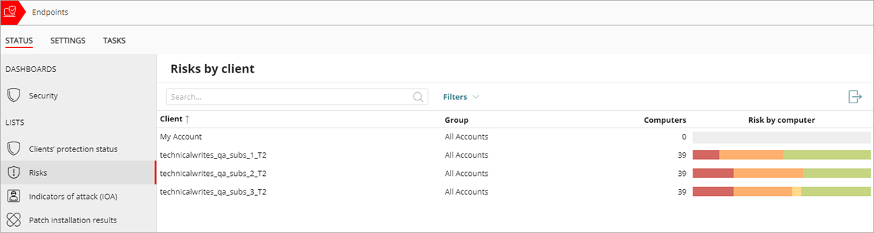 Como Service Provider, usted puede ver, en la página Estado, una lista de sus clientes, que incluye el número de computadoras con riesgos y el nivel de riesgo por computadora.