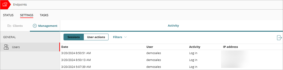 Como Service Provider, puede ver la información del registro de la actividad del usuario y de la sesión en sus cuentas administradas en la página Usuarios. Para la actividad de la sesión, la dirección IP también está disponible.