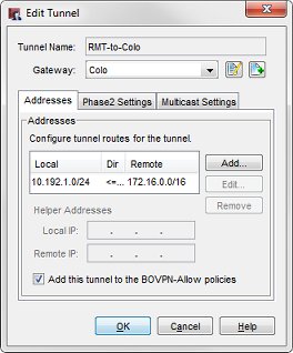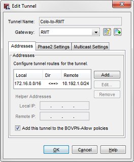 Cuando observe las rutas del túnel, recuerde que los pares local-remoto se definen en relación con las dos redes endpoint para el tráfico del túnel. En algunos casos, la dirección local en una ruta de túnel VPN es la dirección de una red en otro sitio conectado. Por ejemplo, en la configuración Colo, la ruta del túnel Corp a RMT usa la dirección IP de red de la red de confianza en Corp como local, aunque no se encuentre físicamente en el sitio Colo.