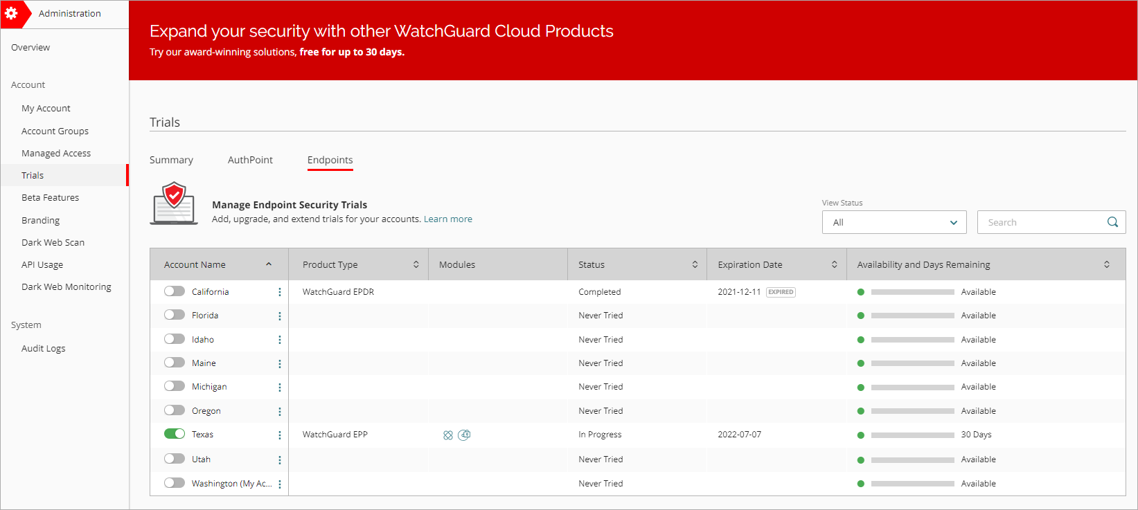 - No Disponible — No hay pruebas disponibles porque la cuenta tiene una licencia WatchGuard EPDR o ha completado todas las pruebas disponibles.