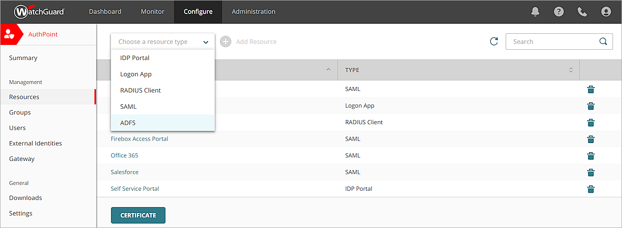 Se abre la página Recursos en la AuthPoint management UI. - En la lista desplegable Seleccionar un tipo de recurso, seleccione ADFS. Haga clic en Agregar.