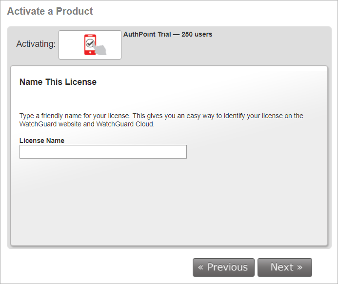 - Escriba un nombre para la licencia de AuthPoint. Esto le brinda una manera fácil para identificar su licencia de prueba en el sitio web de WatchGuard y en WatchGuard Cloud.