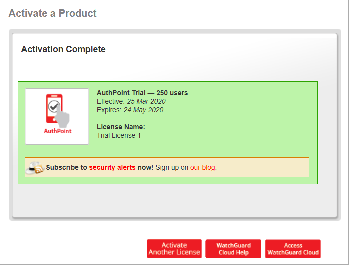 Ahora tiene una licencia de prueba activa de AuthPoint. Los 250 usuarios de la licencia de prueba se asignan a su cuenta de WatchGuard Cloud. La licencia de prueba expira después de 30 días, pero se puede renovar una vez para continuar los servicios por 30 días adicionales.